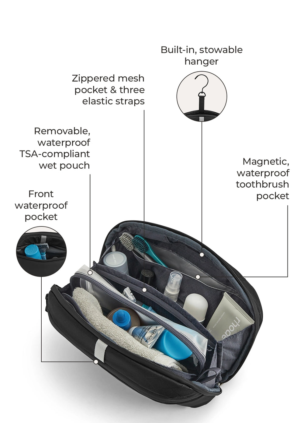 Ventilated pocket keeps your toothbrush dry, safe, and not brushing up on your shampoo.