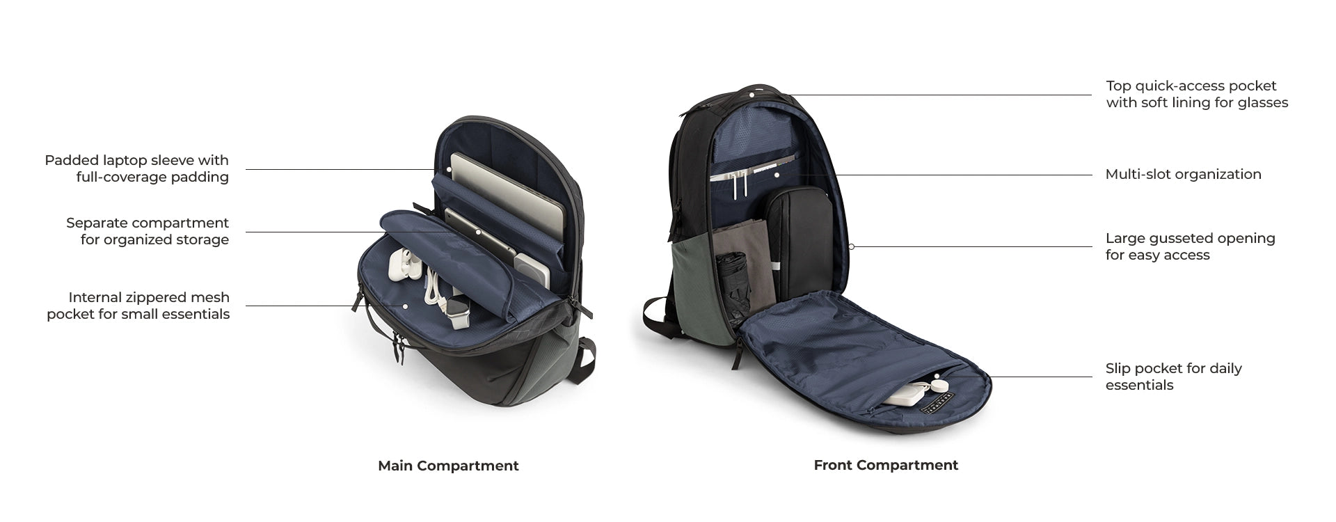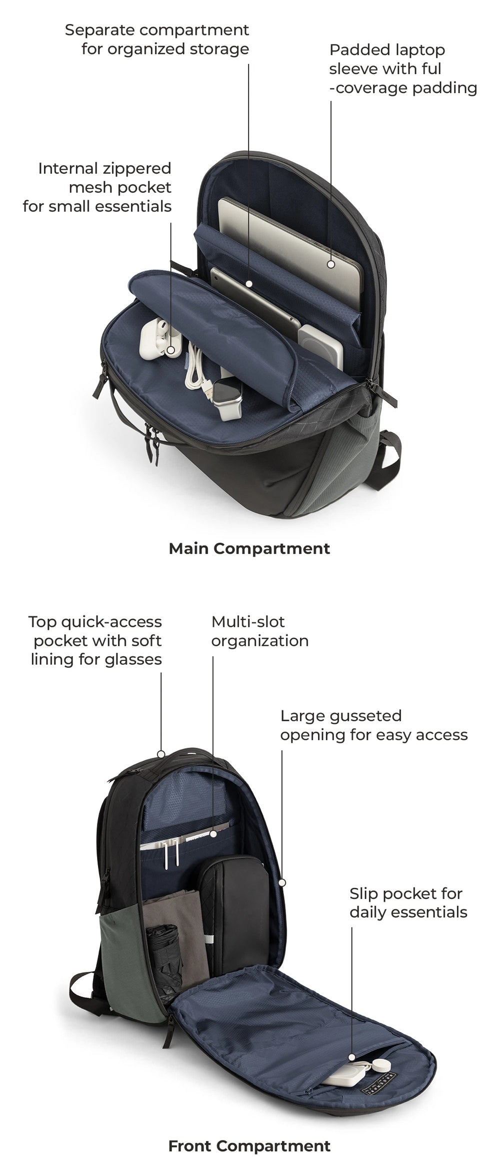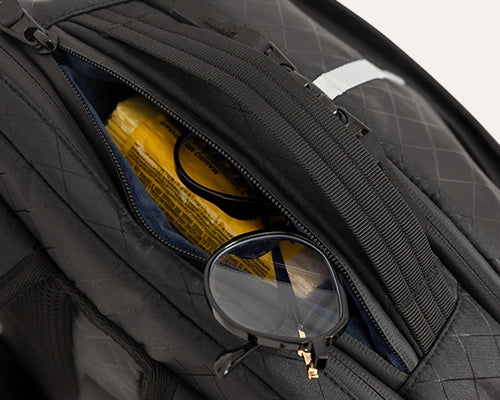 • Dedicated slots for small stuff like cards, pens, keys, and eyewear
