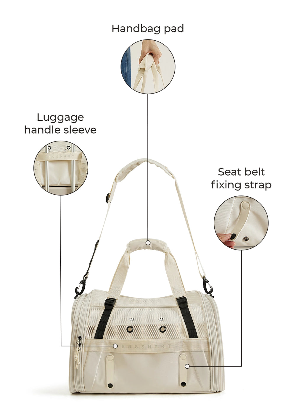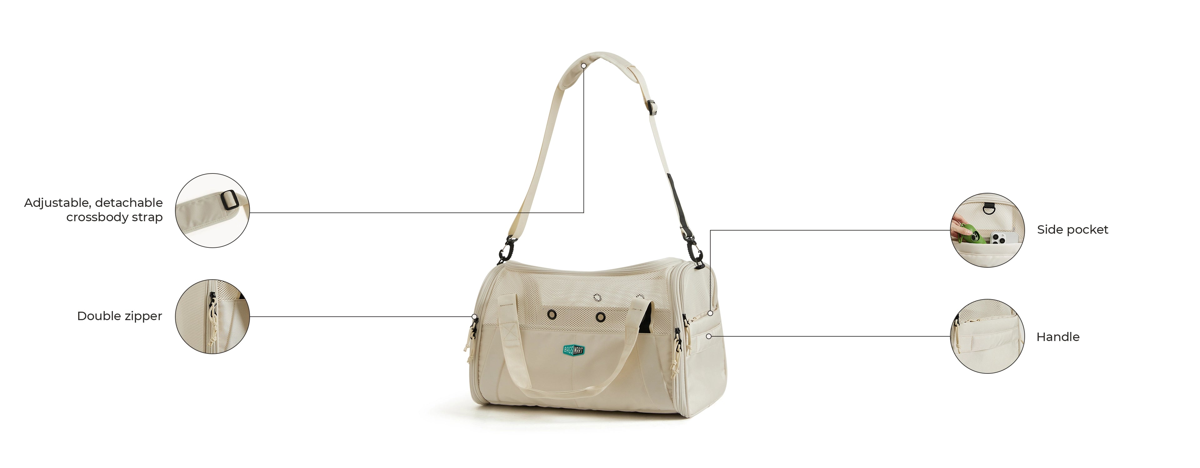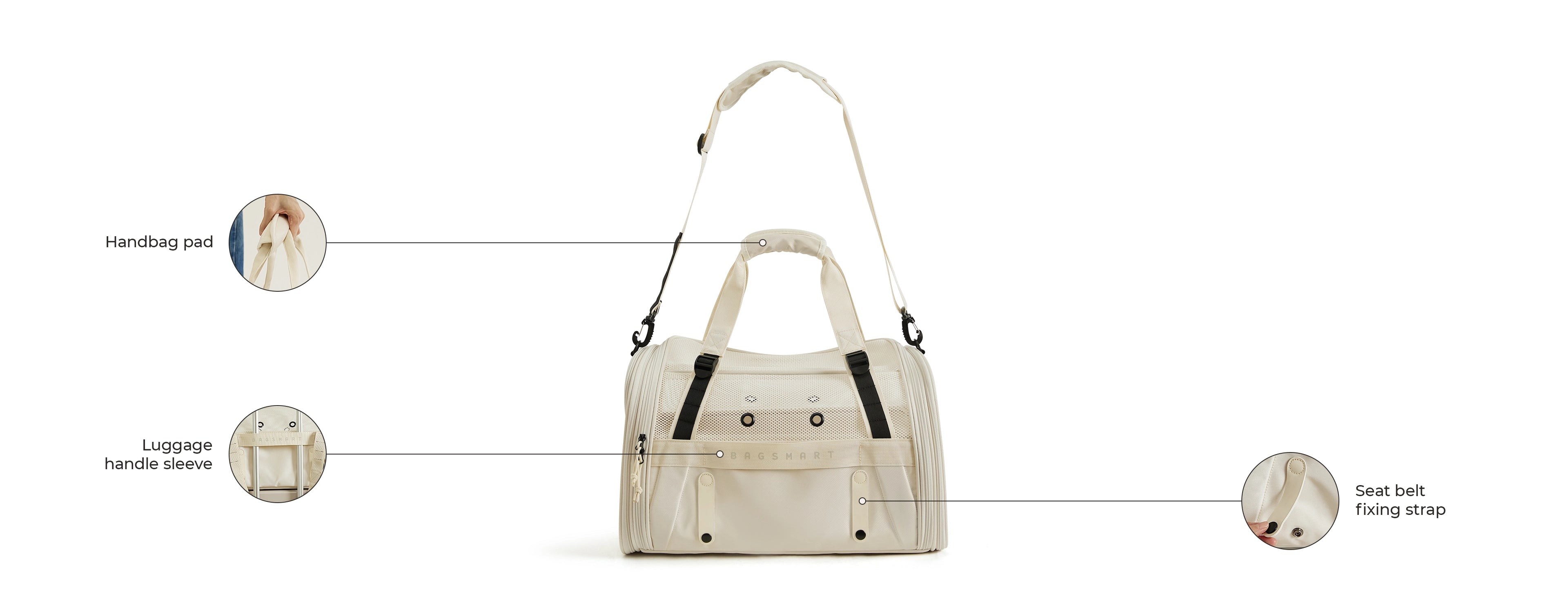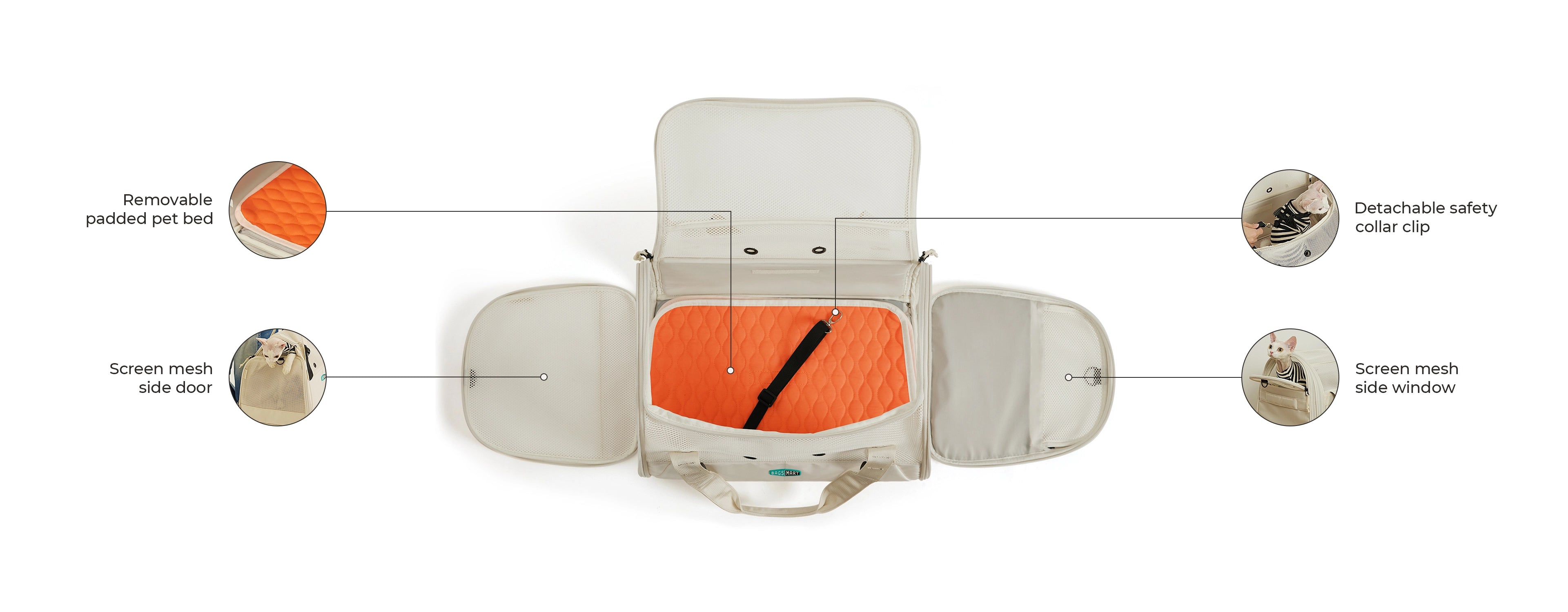 Accessories: Durable SBS zipper, adjustable shoulder strap, removable bottom cushion, and internal leash tether